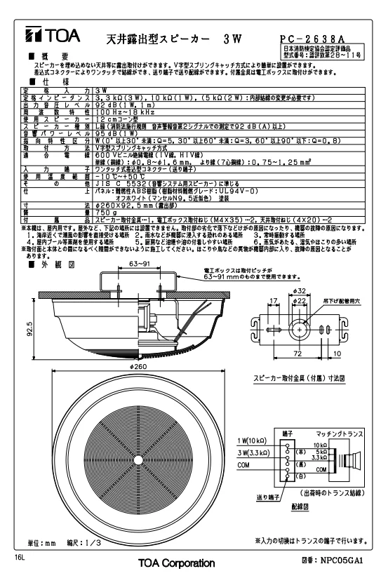 PC-2638A TOA 天井露出型スピーカー 3W 日本消防検定協会認定品