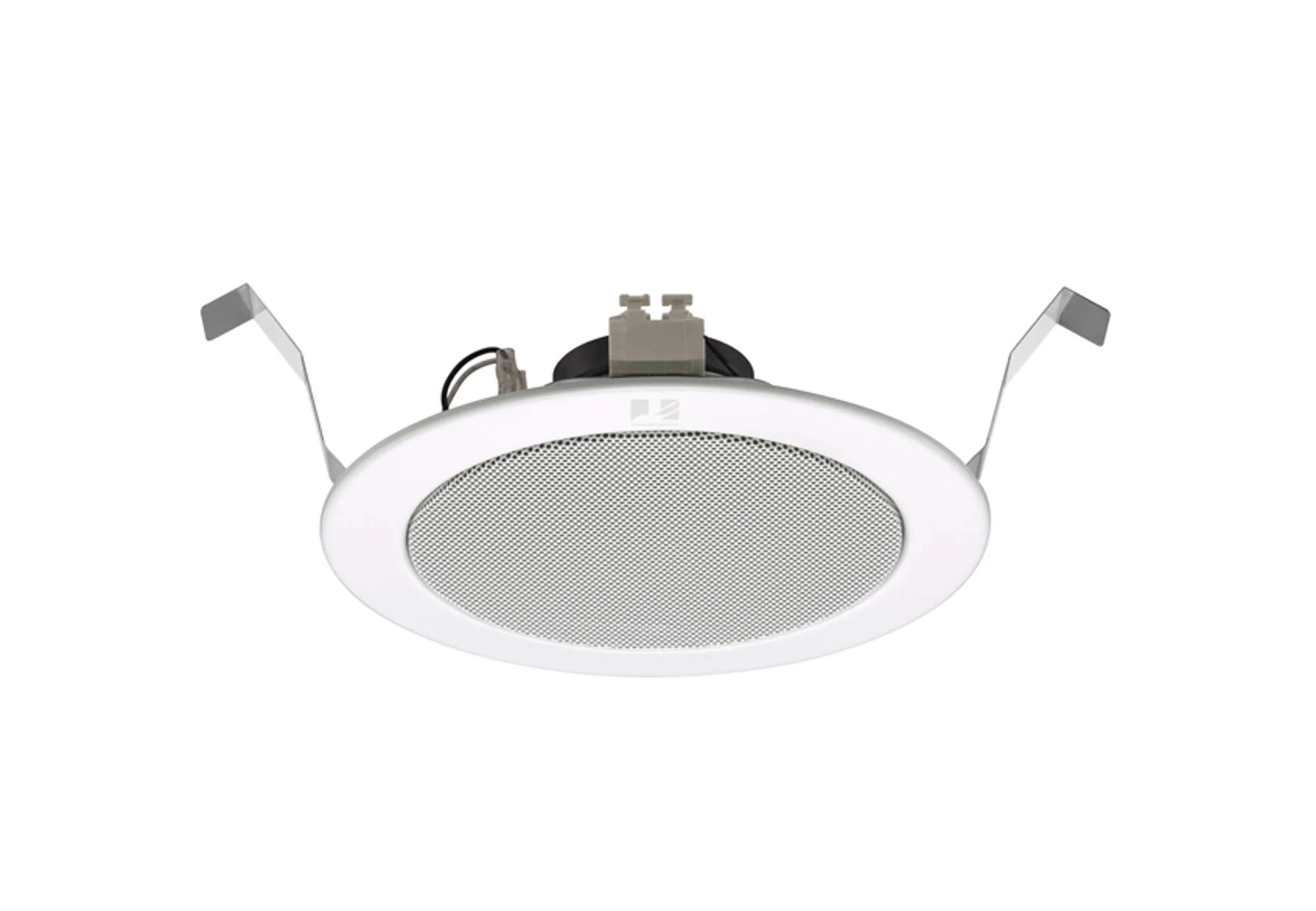スピーカーユニットと前面ネット、取付金具が一体型の金属製天井埋込型スピーカーです。音質を重視した設計で、店舗などのBGM用途に適しています。スプリングクランプ方式により、スピーカーを簡単に天井に取り付けることができます。