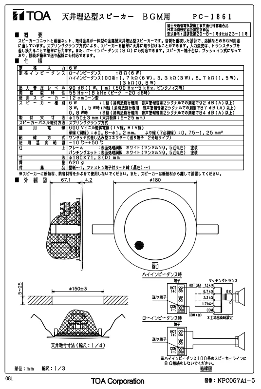 TOA BGM用天井埋込スピーカー PC-1861 12cm 6W ハイインピーダンス/ローインピーダンス