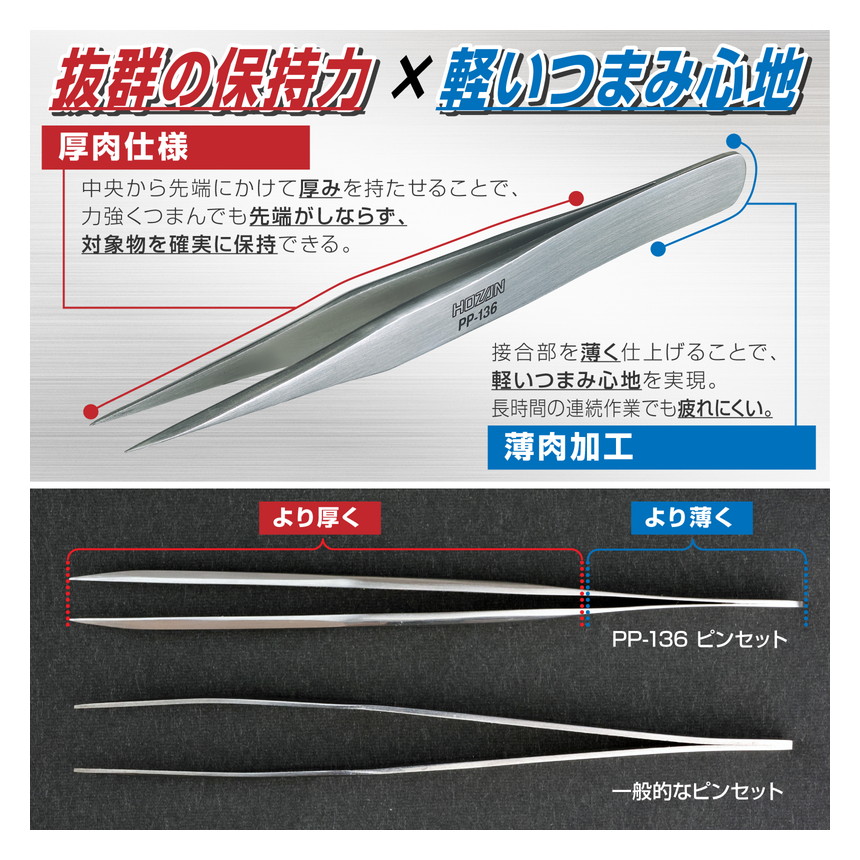 滑らかな手触りと、先端精度にこだわった強力型ピンセット。