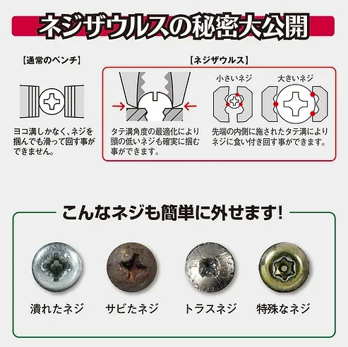 潰れたネジ、錆びたネジを先端のタテ溝で掴んで回せます。