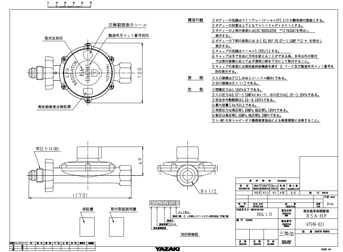 R5A-HF 矢崎エナジーシステム 高性能単段調整器 LPガス 入口接続:POLハンドル(手締め)