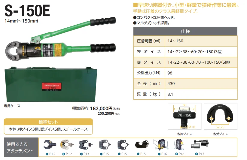 S-150E-0 カクタス 純正品 手動油圧式圧着工具(早送り装置付)圧着ダイスなしセット CACTUS