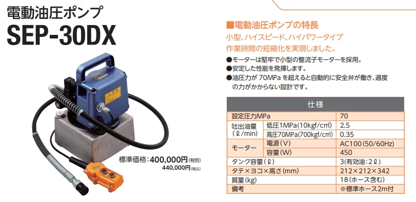 | 備考 | ※50/60Hz兼用。 ※油圧機器のラムシリンダーの前進・後退・ □加圧状態保持などリモコンで自由自在。 ※標準ホース2.0m付。 |