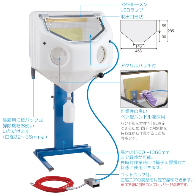 研磨材タンク、エアコンプレッサ、掃除機の各々を接続してフットバルブを踏めば、吸い上げ、吹き付け、研磨材の回収という全サイクルを自動的に行います。