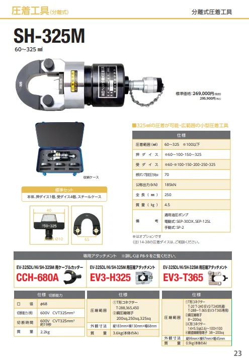 | 備考 | ※60-325mm2まで広範囲の小型圧着工具。 ※カクタスEV-325アタッチメントシリーズの □アタッチメントが使用できます。 ※スチールケース付。 ※適用油圧ポンプ □電動式:SEP-30DX、SEP-12 □手動式:SP-2 |