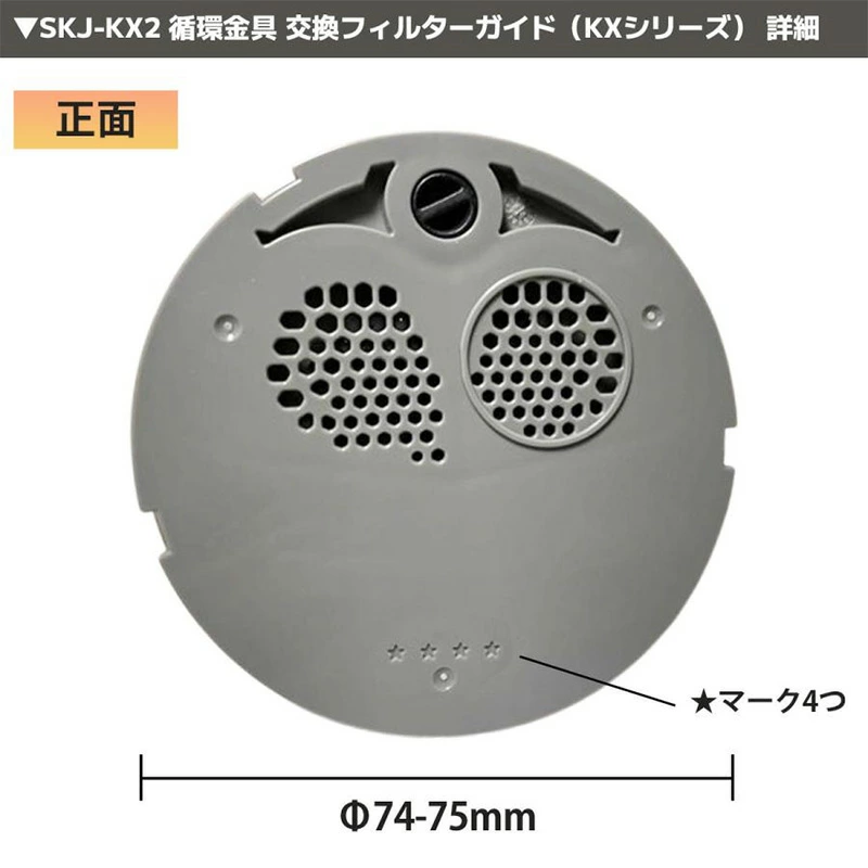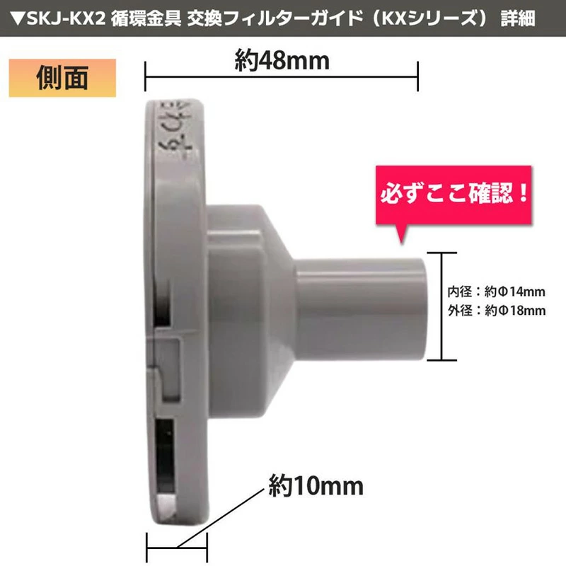 ・フィルター側面が樹脂でできた、樹脂ボディの循環金具KXシリーズに使用するフィルターガイド。フィルター(商品コード:SKJ-KX)は樹脂ボディ、金属ボディ兼用ですが、フィルターガイドはDシリーズ用とKXシリーズ用で異なる点には注意が必要です。