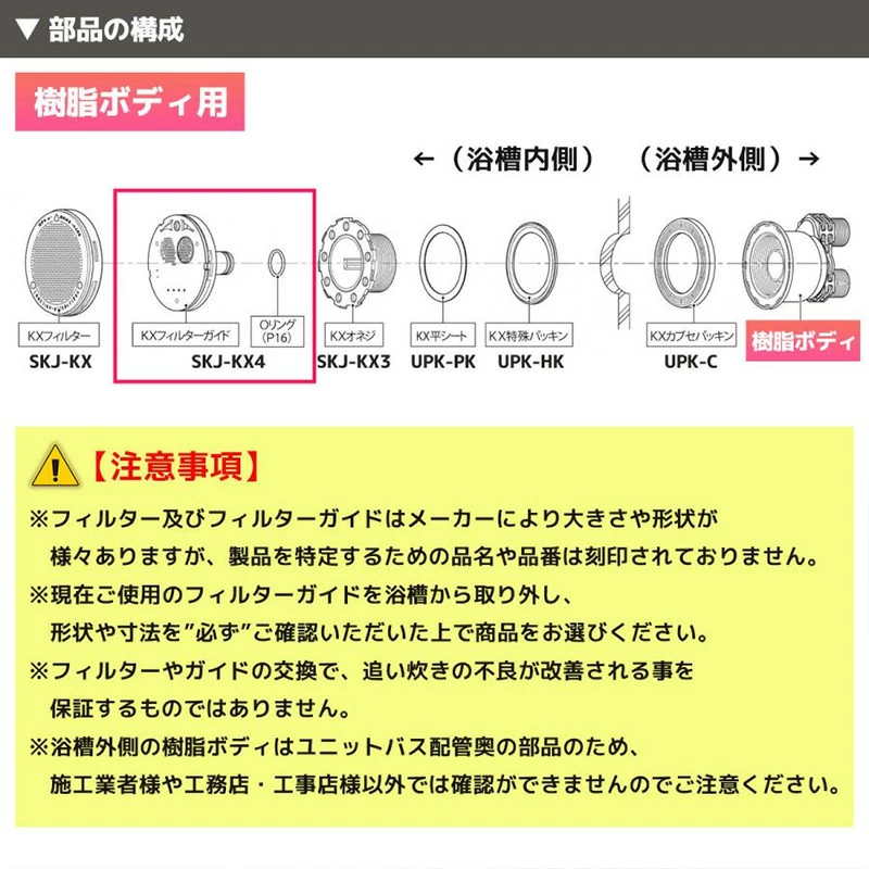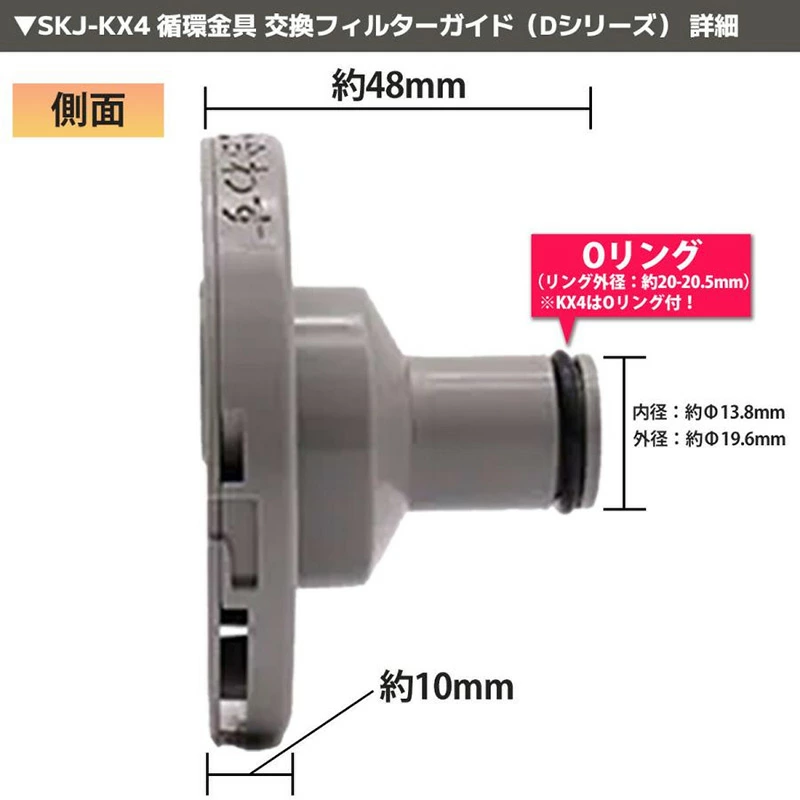 ・フィルター側面が樹脂でできた、樹脂ボディの循環金具Dシリーズに使用するフィルターガイド。フィルター(商品コード:SKJ-KX)は樹脂ボディ、金属ボディ兼用ですが、フィルターガイドはDシリーズ用とKXシリーズ用で異なる点には注意が必要です。