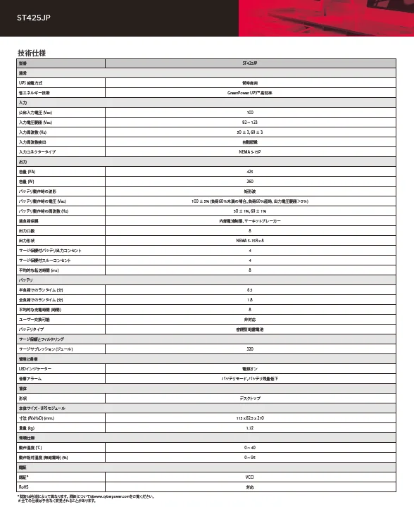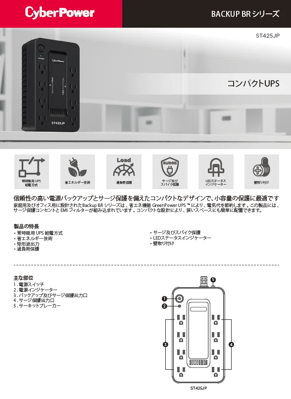 CyberPower ST425JP 「コンピュータ、NAS、ストレージデバイスなどのIT機器の電源バックアップ保護を保証します」この製品は、UPS の電力コストを節約するための省エネ技術を備えた、常時商用給電方式を採用しています。 この製品は、停電時にバッテリのバックアップ電源を提供します。 その他の機能には、UPSステータスを示すLEDインジケータが含まれています。また、サージ保護されたコンセントを備えているため、デバイスを保護できます。