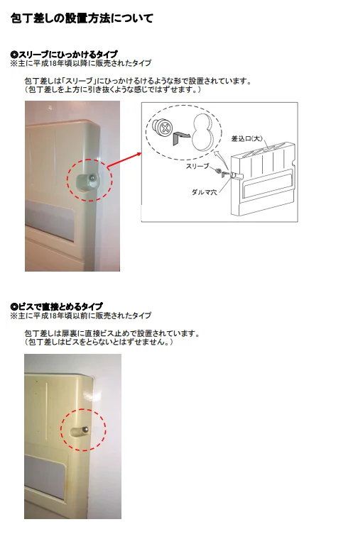 【ご購入時のご注意】スリーブが無く、扉裏に直接ビスで取り付けられている場合は、別途、取付用スリーブとビスが必要ですので、必ず「10146860 コモノセットDXN」のご購入をお願いします。