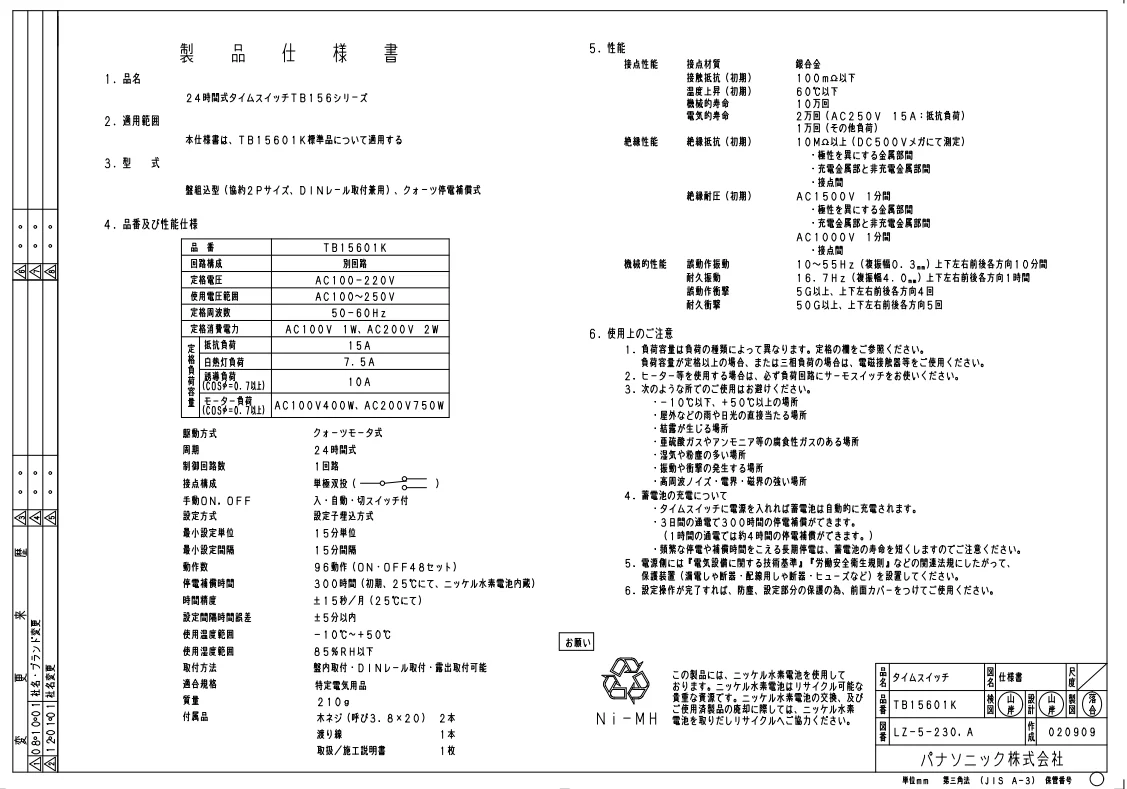 TB15601K パナソニック 協約型タイムスイッチ(1回路型)
