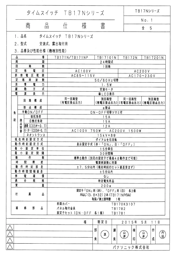 TB17101N パナソニック ボックス型タイムスイッチ 交流モータ式...