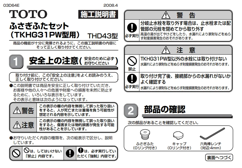 THD43 TOTO 純正部品 ふさぎふたセット(TKHG31PW型用)【送料全国一律275円】