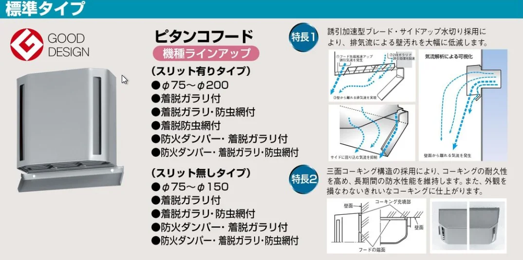 誘引加速型ブレード・サイドアップ水切り採用により、排気流による壁汚れを大幅に低減します。