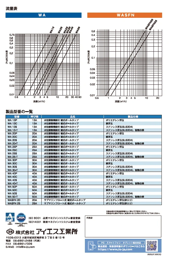 WA-13P アイエス工業所 水位調整機能付複式ボールタップ JWWA認証品