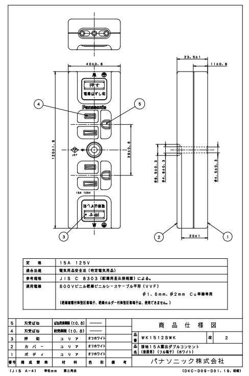 WK1512SWK 5個セット パナソニック 接地15A露出ダブルコンセント 仮設用 フル端子 ホワイト 【全国一律送料450円】