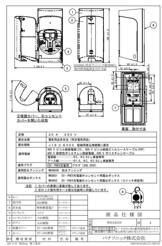 WK4422S パナソニック 純正部品 EV・PHEV充電用 カバー付15A・20A兼用接地屋外コンセント 簡易鍵付 露出・埋込両用 200V用 ホワイトシルバー)
