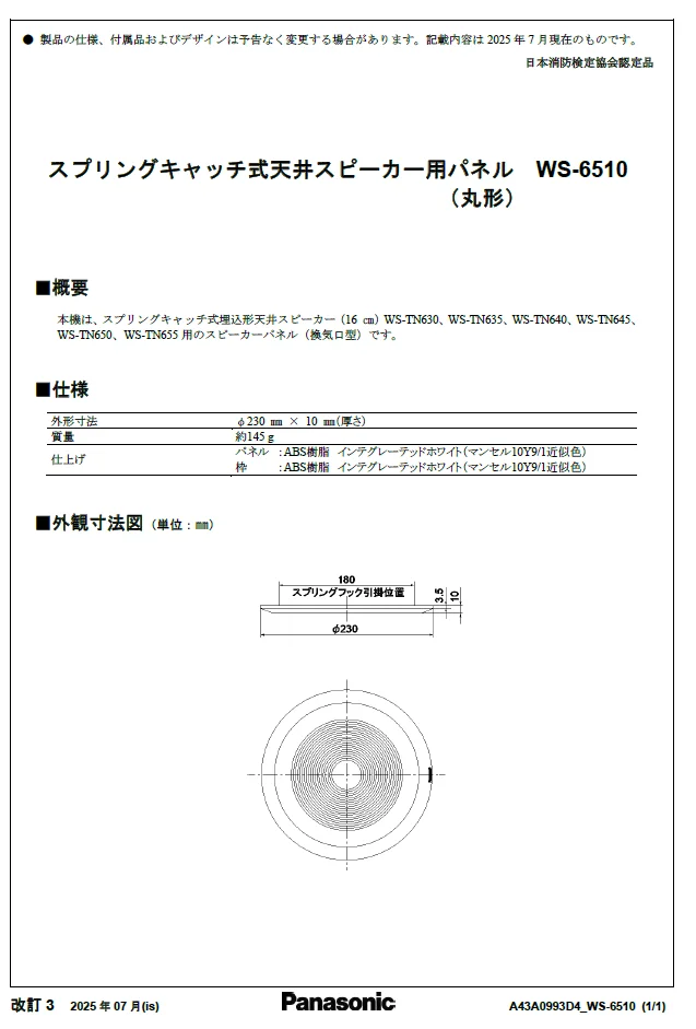 WS-6510 スプリングキャッチ式天井スピーカー用パネル パナソニック 音響設備 本体別売 【メーカー在庫限り】