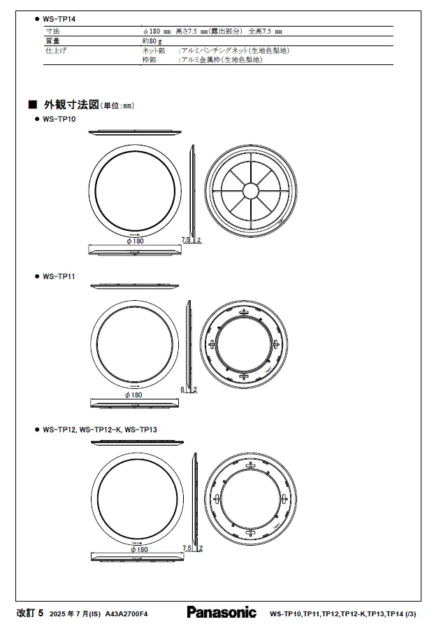 WS-TP10はパナソニックの音響設備用12cm天井埋込みスピーカー用パネルで、本体別売です。