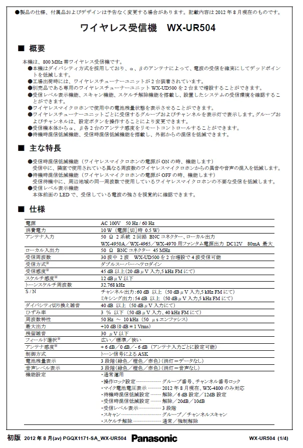 - WX-UR504 800 MHz帯PLLノイズリダクション方式 800 MHz ダイバシティワイヤレス受信機