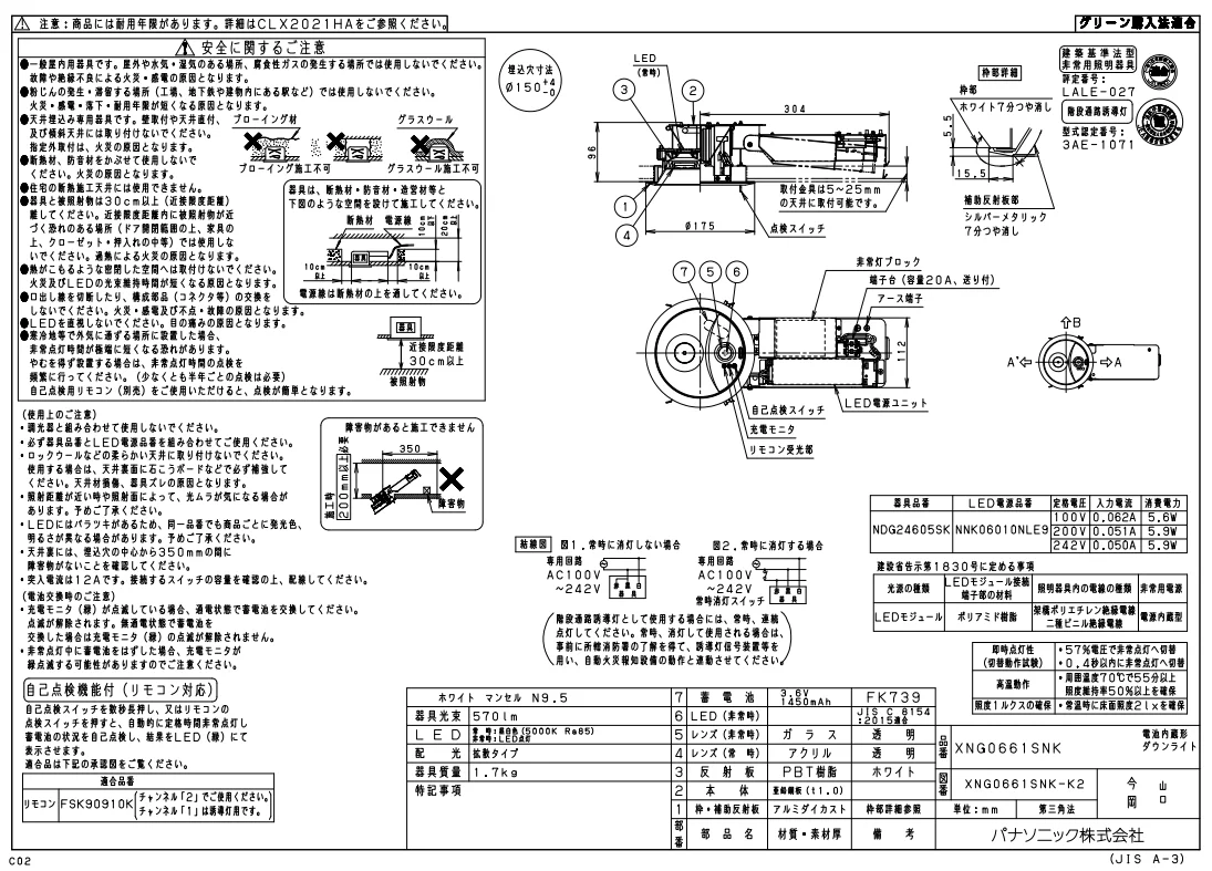 XNG0661SNK LE9 パナソニック 電池内蔵型非常用LEDダウンライト(本体:NDG24605SK+電源ユニット:NNK06010N LE9のセット品)