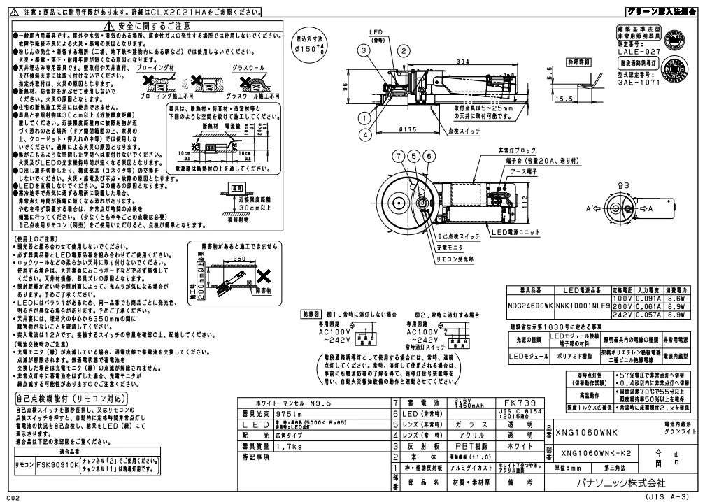 - 種別: 電池内蔵型非常用LEDダウンライト