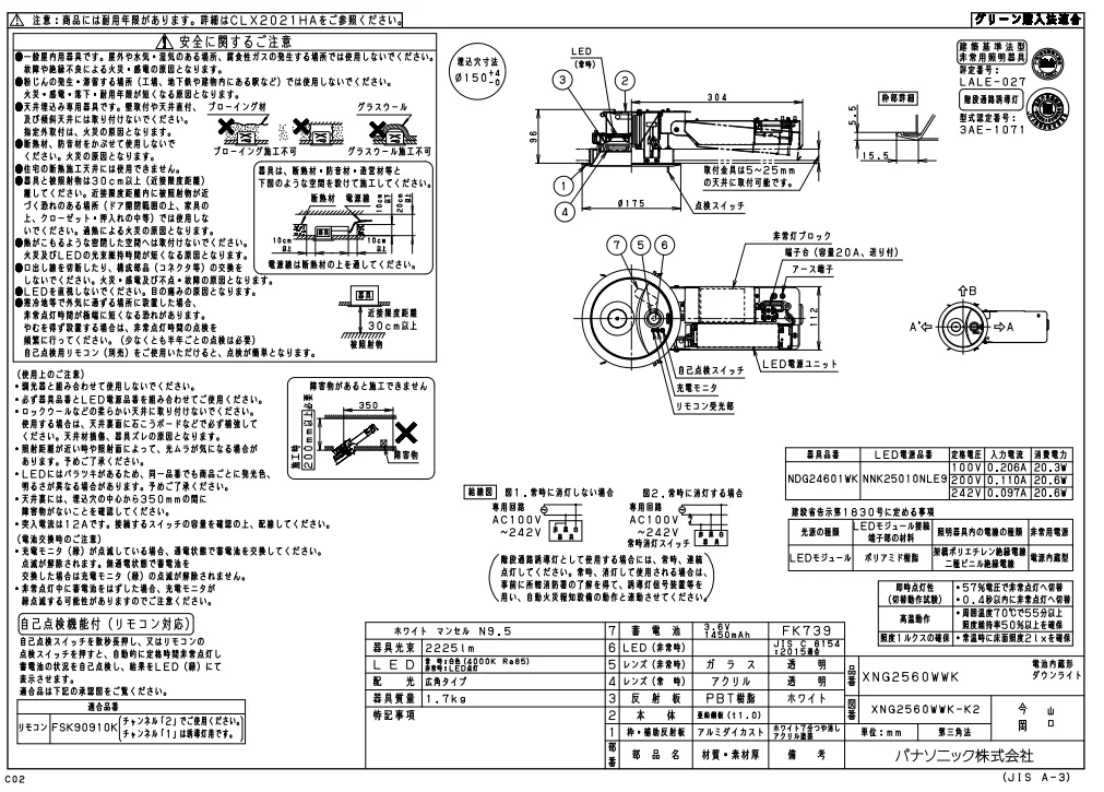- 種別: 電池内蔵型非常用LEDダウンライト