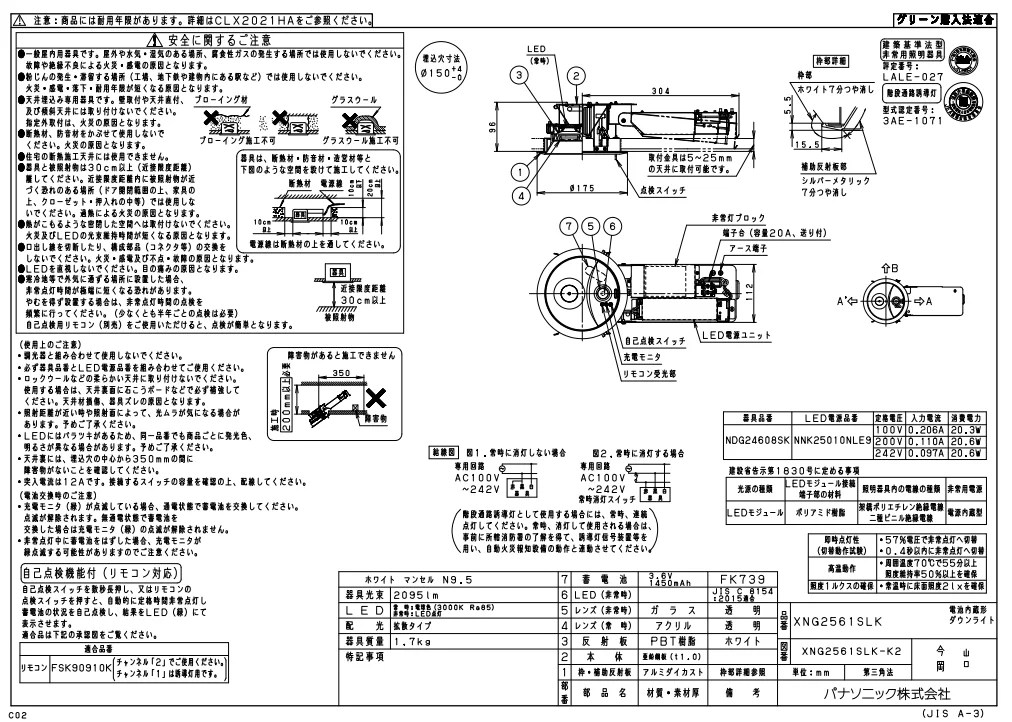 - 種別: 電池内蔵型非常用LEDダウンライト
