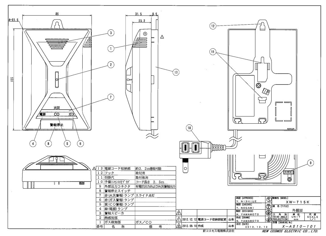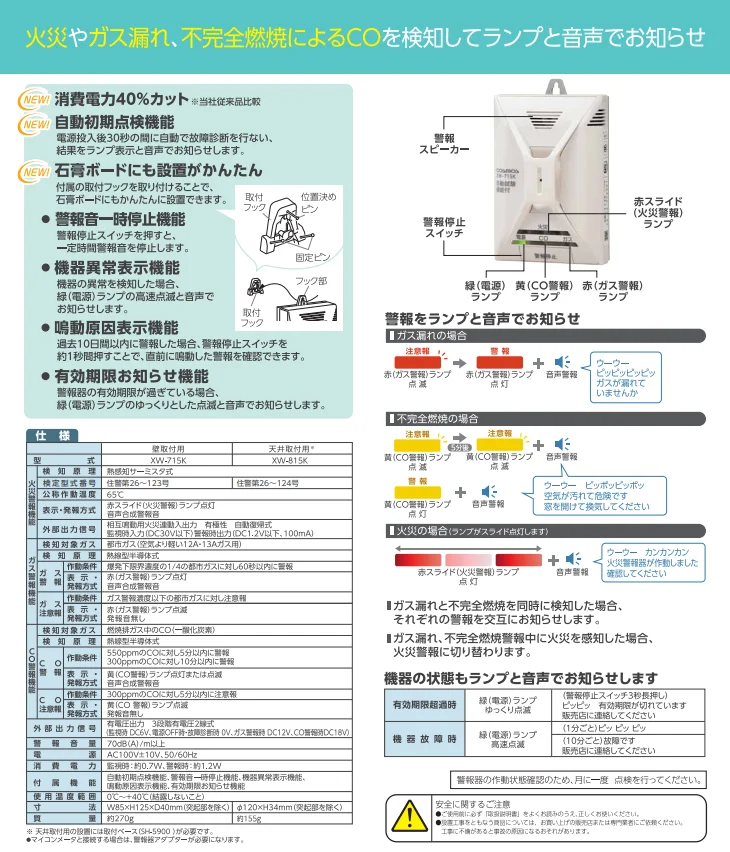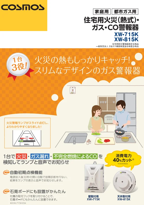 XW-715K 新コスモス 都市ガス用12A・13A 住宅用火災(熱式)・ガス・CO警報器 壁取付型