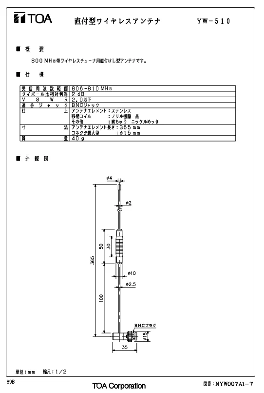 YW-510 TOA 直付型ワイヤレスアンテナ