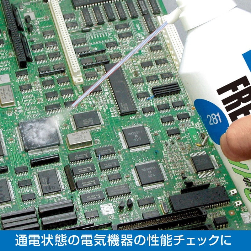 通電中の電子機器の温度変化による不良個所の発見や、性能変化をチェックするための急速冷却剤です。